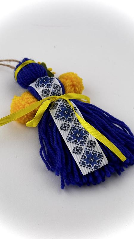 Мотанка - символ добра та благополуччя, символ надії на краще та сильний сакральний предмет. Сама назва ляльки - «мотанка» походить від поняття «мотати», а загальний вигляд такої ляльки представляє собою фігурку людини. Частини тіла такої ляльки з'єднувалися вузликами. Кожна така лялька, була тай лишаються унікальним витвором майстра. В давні часи лялька мотанка виконувала важливу функцію оберега та талісмана для родини. Лялечка-мотанка виконана з нитки. Нитка 100% акрил. Стрічка на голові атласна + тичинки під колір лялечки. На тілі стрічка з вишивкою, пояс - атласна стрічка зав'язана в бантик. На голові є нитка з мішковини за яку можна підвісити лялечку. Довжина виробу 15-16 см
