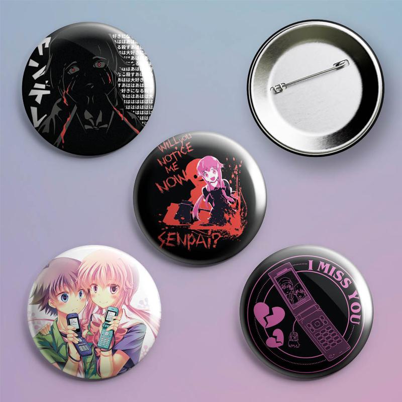 Закатні значки аніме щоденник майбутнього mirai nikki металеві на шпильці 56 мм х 4 штуки