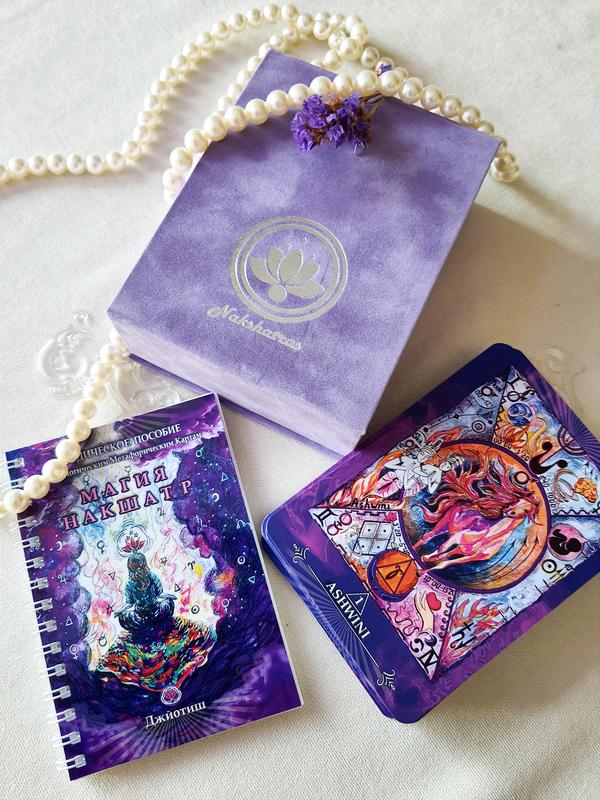 Астрологічні Метафоричні Карти "Магія Накшатр". Накшатри – це місячні будинки. Карти призначені для ведичних астрологів як конкретний інструмент у роботі. Але так само підходять для астропсихологів, психологiв, МАК фахівців. езотериків та людей, що займаються саморозвитком. В них зашифровано у символах та образах багато інформації. У наборі - 40 карт розміром 13Х9 (28 накшатр, 9 планет, 3 карти розшифровки читання, Методичний посібник з використання карт і коробка-скринька на магніті). На допомогу - Методичний посібник з використання Колоди на 116 сторінок. У тому числі там надано техніку роботи з картами та систему Оракул. Так само, я є Автором даної унікальної колоди і створила Телеграм БІБЛІОТЕКУ, яку наповнила та наповнюю всіма трактуваннями карт, техніками роботи з колодою та іншими матеріалами, які допоможуть освоїти та використати у своїй роботі цю чудову колоду. Там же у Бібліотеці на пряму відповідаю на ваші запитання. Після покупки я додаю вас до цієї Бібліотеки.