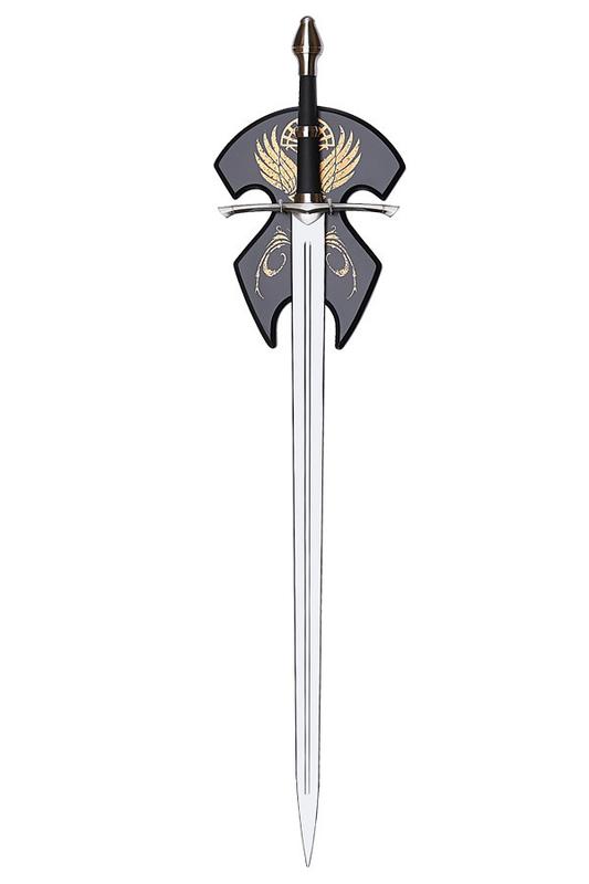 Когда у Питера Лайона, руководящего специалиста фирмы Weta Workshop, спросили, какой из множества созданных им для кино мечей самый любимый, тот ответил: «Мой любимый меч из тех, что я сделал, Анду̒рил. Но в схватку не на жизнь, а на смерть, я бы взял меч Странника. Он по своим параметрам близок к европейскому длинному мечу 15 века и очень практичен в действии.» За основу облика этого меча был взят распространённый в средневековой Европе тип клинкового оружия - полуторный меч (бастард). Названный так за то, что по своим размерам и способу применения он занимал среднее положение между одно- и двуручными мечами. Это было оружие профессионального воина. Рыцаря либо наёмника. Именно таким и предстаёт в начале фильма герой Вигго Мортенсена. Под стать ему и его меч - простой, удобный, чисто утилитарный. И именно поэтому - по-настоящему красивый. Он весьма близок к своим историческим прообразам и выглядит очень функционально и правдоподобно. Не даром его автор называет этот меч своим любимым. 034-С от Grand Way позволит прикоснуться к легенде каждому желающему. И не только прикоснуться, но и повесить к себе на стену. Сделать легенду частью своей повседневности, пустить её в своё жилище. Для этих целей сувенирный меч 034-С подходит наилучшим образом. Изготовлен он настолько качественно, что и сам мог бы играть роль реквизита в кинопостановке. изготовлена из нержавеющей стали марки 420, которую, кроме прочего, широко применяют для изготовления вполне настоящих ножей и инструментов. Никакого пластика и других неуместных материалов. Клинок повторяет собой типичные формы позднесредневекового боевого меча. Такие важные детали анатомии клинка, как долы и спуски, присутствуют, делая сувенир ещё более правдоподобным. Рукоять отделана кожей. Металлические части сувенира до блеска отполированы. На стене, благодаря своему удачному дизайну и высокому качеству изготовления, меч смотрится просто великолепно. Этому способствует и декоративное панно, служащее для размещения клинка. Его очертания крайне выгодно подчёркивают формы самого меча и сочетаются с ним стилистически. .