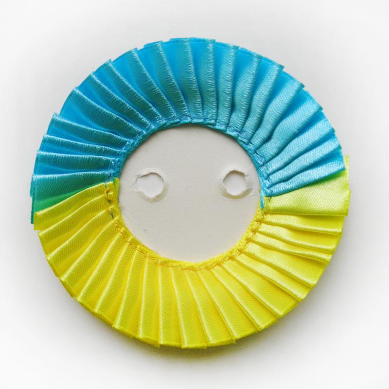 Розетка національна сувенірна під значок з атласних стрічок блакитного і жовтого кольору.