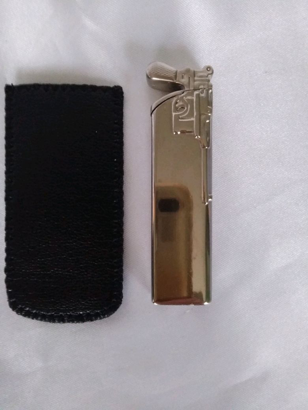 Тип подарунка: Оригінальний Газова запальничка, стовпчик, металева, нова, перезаправляемая, з маузером на фронтальній частині, зручної форми, добре лягає в руку. Клапан заправки і гвинт регулювання інтенсивності полум'я знаходяться у торці запальнички. В комплекті чохол для носіння в кишені. Запальничка заправлена і працездатна. Тип полум'я - звичайне полум'я. Тип підпалу - п'єзокристал.