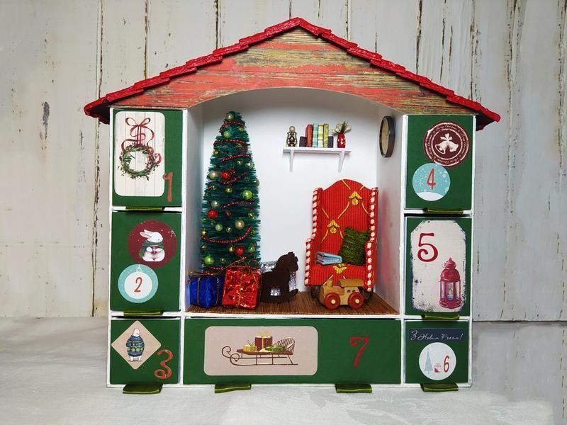 Адвент-календар на 7 днів "З новим роком!" В роботі використані такі матеріали: палітурний картон, дизайнерський папір, тканину, дерево, дзеркала, декоративні елементи. Розміри адвенту: - висота 27 см - ширина 27 см, з урахуванням даху 30 см - глибина 9 див. ВАЖЛИВО: Календар йде БЕЗ наповнення!! Тобто клітинки ви заповнюєте самі, з урахуванням інтересів вашої дитини!! Можливе виконання з урахуванням ваших побажань та ідей! Будь ласка, перед оформленням замовлення уважно читайте правила магазину: - по накладеного платежу не працюю!!! - працюю тільки по 100 % передоплаті (відправлення після повної оплати). - при індивідуальних замовленнях (повтор роботи, якої немає в наявності або роботи за індивідуальним замовленням) передоплата в розмірі 50 % від загальної суми замовлення до початку виконання роботи. Решта суми після закінчення роботи, але до відправки посилки. - якщо ви з якої-небудь причини передумали із замовленням, заставна сума, якою б вона не була, не повертається!! Будь ласка, оформляйте замовлення обдумано! Товар виготовляється на замовлення
