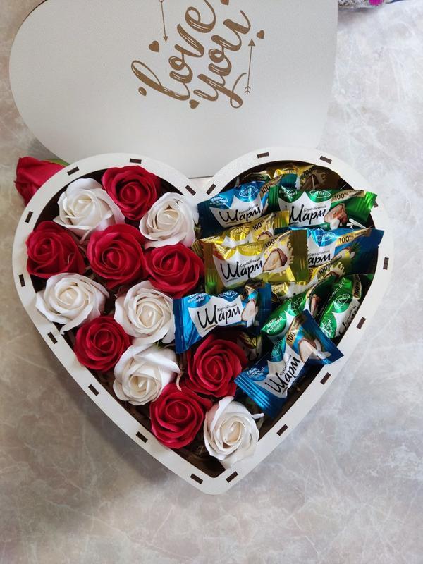 Тип подарунка: Набори Кілька примірників у наявності Скажіть "Так" чарівності та ніжності з нашими подарунковими наборами, наповненими солодкими задоволеннями, які точно підкорять серця ваших близьких! День закоханих, 8 Марта, День народження, Новий рік, І багато інших особливих моментів у житті! В склад входить: Мильні троянди 13 шт Цукерки Шарм 15 шт Наповнювач — стружка 🎁 Розмір коробочки 28 * 27 * 8 Наші подарунки - найкращий спосіб висловити свої почуття