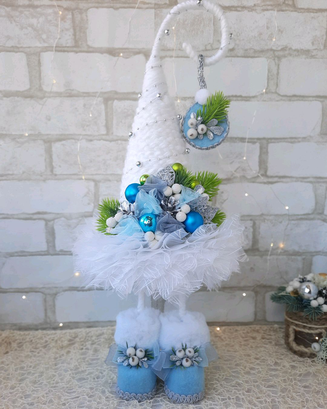 Тип подарунка: Оригінальний Ялинка стане неповторним і оригінальним декором будинку або робочого столу, створить затишок і новорічний настрій . Це прекрасний подарунок для ваших рідних і близьких, друзів і колег який неодмінно приємно здивує, викличе захват і обов'язково запам'ятається . Ялинка виконана з якісної пряжі, органзи з додаванням декоративних елементів.