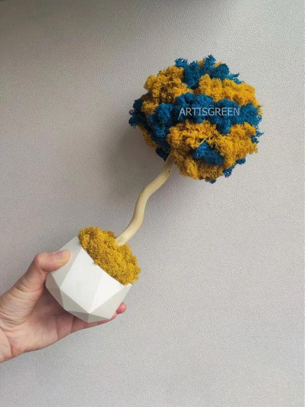 Топіарій, декоративне дерево із синім і жовтим стабілізованим мохом