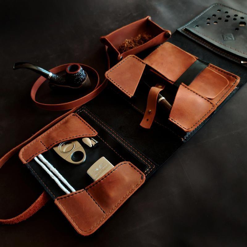 Модель Mr. Black Шкіряна футляр для тютюну — це стильний і функціональний аксесуар, призначений для двох люльок і кількох сигар. Він має кишеню для тютюну з поліетиленовою плівкою, яка допомагає зберегти тютюновий запах і свіжість, позбавляючи від необхідності носити окремий пакет. Цей футляр має відділення, призначені для всіх необхідних аксесуарів для насолоди люльками та сигарами. Завдяки цим відділенням ви можете легко переносити все, що вам потрібно, включно з трампером для труб, очисниками, запальничкою та гільйотиною для сигар. Виготовлений з використанням високоякісної обробки та натуральної шкіри, цей виріб стане чудовим подарунком для поціновувачів натурального тютюну, які цінують витончену майстерність і увагу до деталей. Шкіра Crazy Horse, використана для виготовлення цієї сумки, додає чохлу вінтажності та виразності, підвищуючи його загальну естетичну привабливість. Шкіра також ідеально гармонує з трубками, створюючи міцний і захисний шар, який збереже їх у безпеці. Завдяки поєднанню стилю та функціональності цей футляр ручної роботи є ідеальним вибором для тих, хто любить курити люльки та сигари та хоче мати аксесуар преміум-класу для їх носіння. У комплект входить тарілка для тютюну та підставка для люльки або сигари. Розміри (см): 20x18x4.5