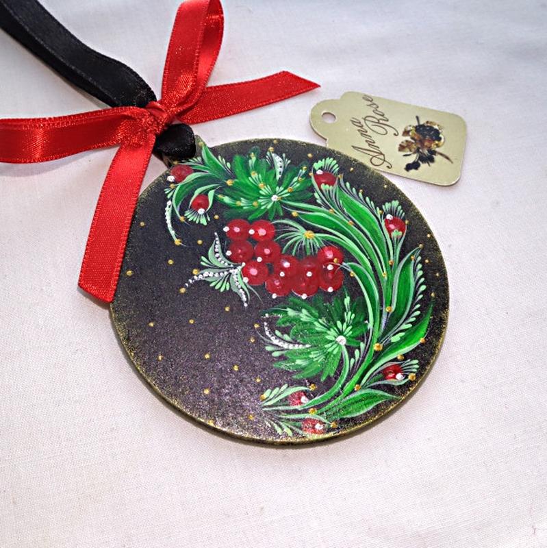 Декоративна кулька, з авторським розписом. Ексклюзивний виріб. Прекрасний, пам'ятний подарунок в українському стилі - Малюнок виготовлений вручну. - Акриловими фарбами та покритий лаком. - Куля черна. - Діаметр кулі 8 см. - Декорований стрічкою, атласною або репсовою.