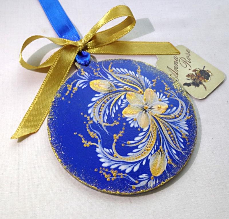 Декоративный шарик, с авторской росписью. Эксклюзивное изделие. Прекрасный, памятный подарок в украинском стиле - Рисунок выполнен вручную. - Акриловыми красками и покрыт лаком. - Шар фон васильковый. - Диаметр шара 8 см. - Декорирован лентой, атласной или репсовой.