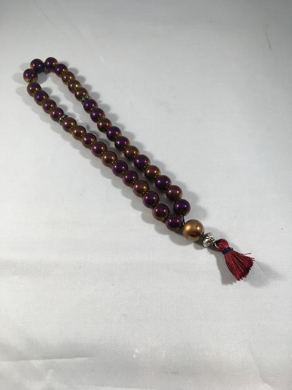 Красивые, удобные, эргономичные, из природных материалов! Представляю вам четки из Натурального, тонированного в фиолетовый цвет Гематита. Бусины диаметром 10 мм легко передвигаются по шнуру, позволяя сосредоточиться на счете. Гладкая, отлично отполированная поверхность бусин тактильна и приятна. Разделители отличаются формой, поэтому можно использовать четки не глядя на них. Расстояние между бусин подобрано оптимальным образом так, чтобы не было ни тесно, ни чересчур свободно. Это чудесный инструмент, который, благодаря своему небольшому размеру, позволит медитировать в любом месте. Красивая кисточка и металлическая бусина дополняет визуальный ряд и придаёт чёткам завершённость.