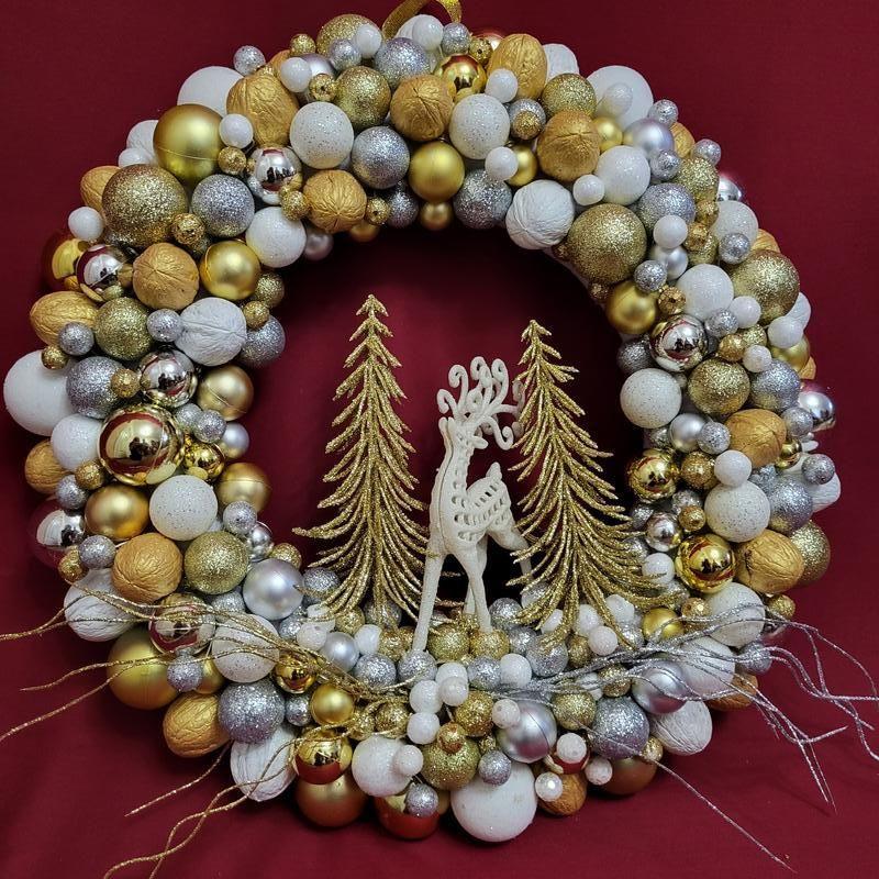 Новорічний різдвяний вінок з кульок на двері з оленем та ялинками