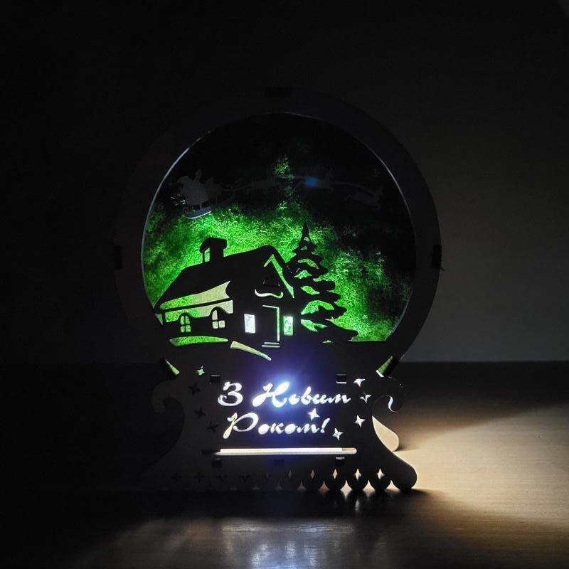 Дуже особливий та казковий подарунок на новий рік, подарунок на Миколая дітям, подарунок на Різдво для Ваших рідних і близьких Новорічна композиція у вигляді кулі білого кольору на підставці з зимовим казковим сюжетом. Всередині куля наповнена салатовим мохом, який в поєднанні з білим кольором дуже яскраво і контрастно виглядає. Така композиція з підсвіткою, тобто ввечері та вночі це ще чудовий нічник для Ваших затишних вечорів... Знизу ми ставимо лед свічку , за рахунок чого відбувається освічування. Переглядайте фото ввечері і вдень в галереї. Додаткові характеристики: Тип: Новорічні статуетки