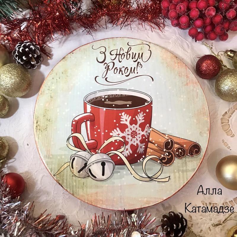 Кругла дерев'яна кухонна дошка з новорічним мотивом. Декор у техніці декуппаж із попереднім випалюванням.Ету дошку можна використовувати і за прямим призначенням, і для гарного подавання десертів і нарізок. Прекрасний новорічний подарунок! І корисний і гарний! Діаметр виробу 20 см.