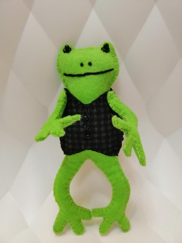 Діловий Жабеня. М'яка іграшка з фетру, жилетка — трикотаж і бісер. Наповнювач холофайбер. Довжина іграшки 15 см, ширина 6,5 см