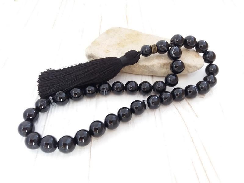 Чотки з великих агатових намистин для медитації, читання молитов. Для чоток використані 12мм намистини чорного Агата і красива шовковиста китиця. Чотки переборні, без вузлів. Всі вироби красиво пакуємо. ВАЖЛИВО!!! Ми використовуємо високоміцний шнур з нитки Dynema. Інформація від виробника: "надміцне поліетиленове волокно виробляється за допомогою унікального процесу, в результаті якого молекули набувають нову паралельну орієнтацію, що дає волокну унікальні властивості, неймовірну міцність, що перевищує навіть сталь." Зверніть увагу, що всі наші вироби виготовлені вручну з натуральних матеріалів, тому можливі невеликі розбіжності в зовнішньому вигляді, кожне з них буде унікальним саме для вас. Метафізичні властивості каменів: Чорний Агат залучає удачу. Збільшує концентрацію і ясність. Допомагає в подоланні недоліків, страхів і самотності. Знімає пристріт, допомагає усунути невезіння. Має заспокійливий ефект під час стресу. Дає відчуття сили і мужності. Потужний цілитель.