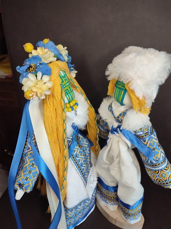 Ляльки Мотанки пара закоханих Чудовий подарунок молодятам Стане вірним оберегом дому і сім'ї Висота 32 см На дерев'яній підставці Виготовлено з любов'ю Авторська робота Матеріал: Тканина, стрічки, нитки, декоративні елементи, квіточки Також роблю під замовлення Товар виготовляється на замовлення