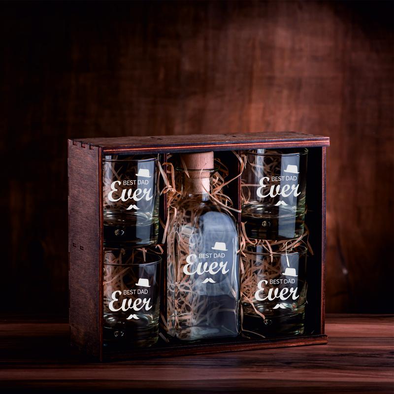 Подарочный набор для виски. Набор для виски в подарочной коробке станет отличным подарком на Рождество и Новый год! Коробка выполнена из натуральной березовой фанеры толщиной 4 мм. Фанера шлифуется, затем при помощи лазерной резки вырезается заготовка коробки, собирается и вскрывается краской с эффектом старения. На крышке коробки, стаканах и бутылке сделана лазерная гравировка. Благодаря такому виду нанесения, рисунок не стирается и не блекнет, а значит стаканы даже можно мыть в посудомоечной машине. Все наборы виски, которые мы делаем, сделаны с любовью и вниманием. Наши стильные стаканы и графины будут служить их владельцу в течение многих лет в будущем. Этот набор виски станет наиболее подходящим подарком для любого мероприятия - в том числе свадьбы, помолвки или дня рождения. Мы уверены, что вашим друзьям понравится этот подарок! Размер: Декантер (бутылка): диаметр - 8 см, высота – 21 см. Объем 700 мл. Стакан: диаметр – 8 см, высота – 10 см. Объем 310 мл. Коробка: 27x23x10 см.
