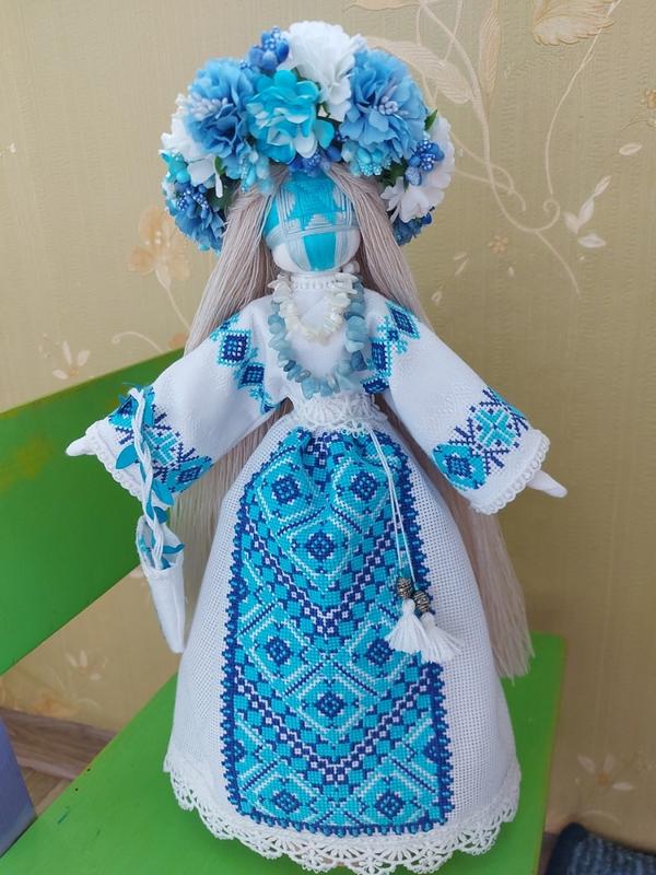Пропоную авторську ляльку Мотанка Виконана в техніці мотанка Ручна вишивка Натуральні матеріали На дерев'яній основі Прикраси натуральне каміння Висота 30-35 Волосся мериносова пряжа