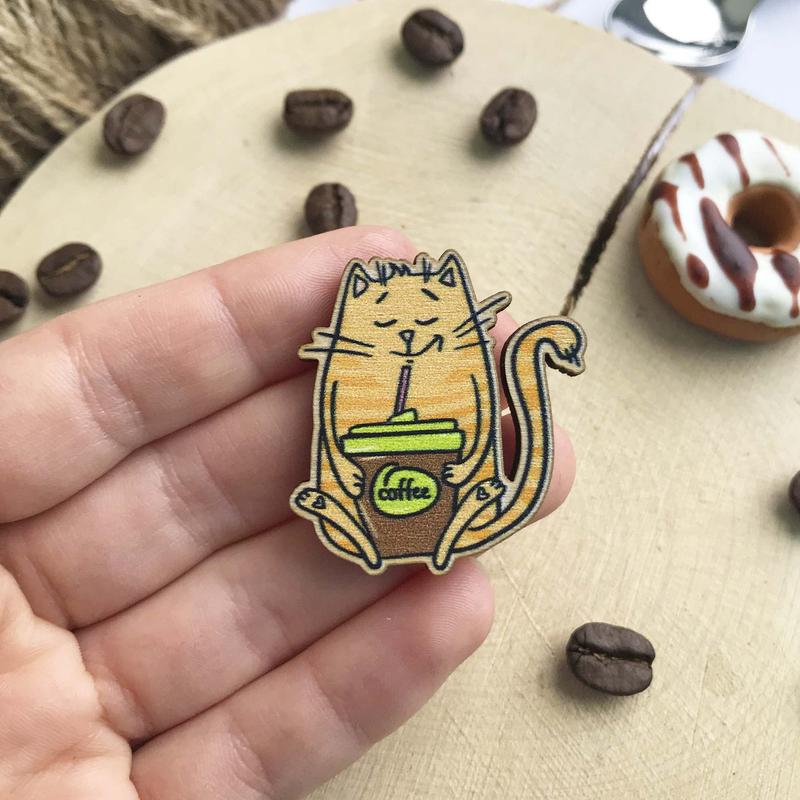 Значок из дерева «Рыжий котик с кофе» может служить в качестве сувенира или же броши, прицепите его на свитер, сумку, рюкзак, шарф или же шапку и поднимите настроение себе и всем окружающим! А если вдруг Вы не нашли то, что искали, просто свяжитесь с нами и мы поможем воплотить в жизнь Ваши задумки.