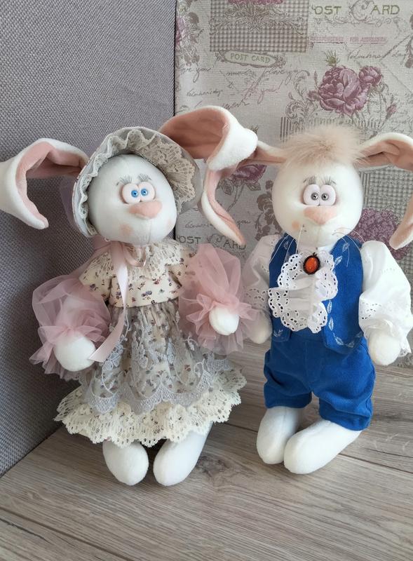Як би було можливо потрапити у казку, чарівну, добру та щасливу дивовижну країну. А чому б і ні? Вже декілька років ми створюємо казку, чарівних звірят, які дарують тепло та радість. Інтер'єрні іграшки ручної роботи - це вишуканість та смак. До будь якого свята приємний та дивовижний подарунок. Зріст зайців 30 см без урахування вушок. Матеріал фліс, наповнювач синтепон, тканини з бавовни, полімерна глина, натуральне хутро. Ціна пари 2500 грн
