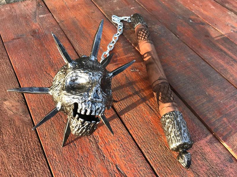 Шукаєте незвичайну булаву ручної роботи? Ось вона. Ця ручна булава на ланцюжку з дерев'яною ручкою у вигляді черепа виконана в техніці художнього кування. Вона має дуже декоративну ручку з металевими ковпачками, які додають приємну текстуру та вигляд. Розміри булави: - Довжина ручки: 45 см - Довжина ланцюга: 45 см - Діаметр кулі (без шипів): 10 см Шипи на кулі тупі, а череп лакований для додаткового захисту. У вартість включена персоналізація (ім'я, дата, коротке повідомлення) на ручці булави, що робить її унікальним і значущим подарунком. Кулька булави порожня всередині, що робить її легкою та зручною у використанні. Це чудовий подарунок на річниці весілля (6, 11), день народження, День батька та багато інших святкових подій. Булава може стати найкращим функціональним витвором мистецтва та прикрасою у вашому домі.