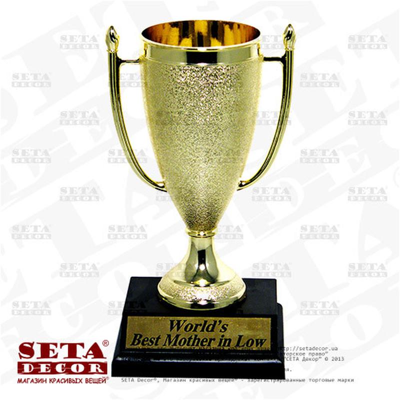 Кубок - найкраща теща в світі, до дня народження і просто так. - Матеріал - Підставка ― Пластик - Кубок ― Пластик - Табличка ― Пластик з металізацією і видавленим написом - Розмір - Довжина ― 8,75 см, - ширина ― 7,5 см, - висота ― 17 див.