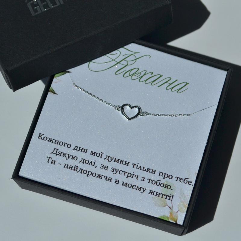 Незабутній браслет у формі серця - ідеальний подарунок для коханої. Цей витончений і стильний браслет є втіленням любові і романтики. Виготовлений з високоякісних матеріалів, він буде чудовим доповненням до будь-якого вбрання та нагадуванням про важливі моменти в житті коханої людини. Характеристики • ювелірний сплав металів та родоване покриття 925 проби • ланцюжок 16-19 см. • індивідуальні листівка із перламутрового картону • подарункова коробка із високоякісного картону чорного кольору, розмір 8*8*3 см Браслет у формі серця символізує безмежну пристрасть і глибокі почуття кохання. Його дизайн неперевершений - гладкі лінії і блискуче покриття додають йому чарівності і елегантності. Кожен раз, коли ваша кохана подивиться на цей браслет, вона згадає вашу любов і тепло, які ви несете в своєму серці. Незабутній браслет у формі серця може бути подарований на будь-яке свято або просто в якості прояву уваги та любові. Він стане прекрасним символом ваших почуттів і нагадуватиме про вашу непереборну силу кохання. Замовляйте незабутній браслет у формі серця прямо зараз та зробіть вашого коханого щасливим! Цей подарунок неодмінно стане виразом вашої безмежної любові та турботи. В комплекті подарункове упакування та інструкція по догляду за прикрасою. Такий подарунок буде єдиний та унікальний, адже це ручна робота. Відправлення здійснюється кожен день транспортною компанією Нова пошта. Також, за бажанням, Ви можете відправити подарунок анонімно. Доступна оплата при отриманні та на карту. Виконуємо персоналізований текст на листівці. Для цього надішліть Ваш текст і ми підготуємо дизайн майбутньої листівки. Термін виконання індивідуального замовлення 1-2 дні. Текст розміщується на листівці 8*8 см. Вартість персоналізованого дизайну +50 грн до суми замовлення.