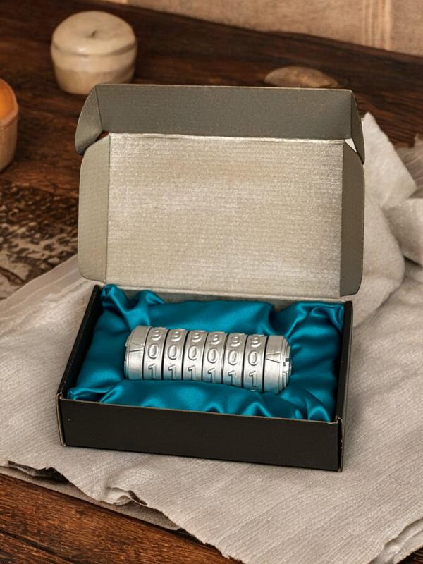 Подарунок оригінальний чоловіку -- головоломка з секретом "Криптекс" з подарунком Флешкою всередині та змінним кодом Криптексу Срібло Найпопулярніша відповідь на запитання "Що тобі подарувати?" -- це, звичайно ж, "Не знаю"! Шукаєте незвичайний та креативний подарунок для чоловіка? Криптекс -- ідеальне рішення! Це не просто стильний аксесуар, а й захоплива інтелектуальна головоломка, яка вимагає розгадати код. Після відкриття власник зможе зберігати свої секрети в цьому надійному схованці. Усередині криптексу вже захований сюрприз -- флешка, готова для зберігання важливих файлів або особистих секретів. ### Як працює криптекс? Дивіться "Криптекс" -- унікальна математична головоломка -- гра, яка перетворить сам процес відчинення подарунка в подарунок! Чому це чудовий подарунок? • Інтелектуальний виклик. Криптекс пропонує цікаву математичну головоломку, яка розвиває логіку та терпіння. • Готовий сюрприз. Після розгадування коду всередині міститься флешка, що додає завершеності подарунку. • Практичний і стильний. Цей аксесуар не тільки має елегантний вигляд, але й слугує надійним місцем для зберігання важливих речей. • Унікальний підхід до подарунку. Такий сюрприз точно запам'ятається і захопить увагу. ### ### У Криптексі встановлений випадковий код* із 6 цифр, які потрібно розгадати. Для цього додається набір цікавих математичних завдань. Після успішного відкриття власник зможе змінити код на свій і використовувати криптекс для зберігання своїх секретів або цінних речей. *Код відповідь ми докладаємо в посилці, якщо відправляєте одержувачу безпосередньо, вкажіть в коментарі до замовлення, не вкладати відповідь у посилку. До набору входить: - Криптекс - Тканинна подушка - Подарункова коробка зі стрічкою - Флешнакопичувач із файлом Привітання - Конверт - Математичні завдання - Наклейка для конверта - Подарунковий пакет - Інструкція Подарунок ідеально підходить для чоловіків, які цінують оригінальні речі та люблять інтелектуальні виклики. Даруйте не просто подарунок, а цілу історію з таємницею і сюрпризом усередині! Характеристики • Розміри криптексу: 11,4 см (загальна довжина) х 4,3 см (діаметр) • Розміри внутрішнього отвору 9 см (довжина) х 2,3 см (діаметр). • Код: встановлений випадковий код (з можливістю зміни) • Флеш накопичувач: 4ГБ • Колір: сріблястий • Матеріал: пластик