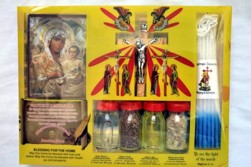 Ерусалимський набір поломника з Святоїземлі.У набір входить хрест з натурального оливкового дерева з разп яттям з металу.Свята вода з річки Йордан Ікона благословенна Есусалимська .Свята земля.Освяченна олія.33 ерусалимськи свічи.
