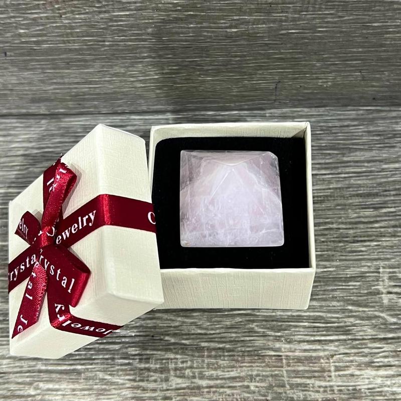 Сувенір велика піраміда з натурального каменю рожевий кварц в подарунковій коробочці
