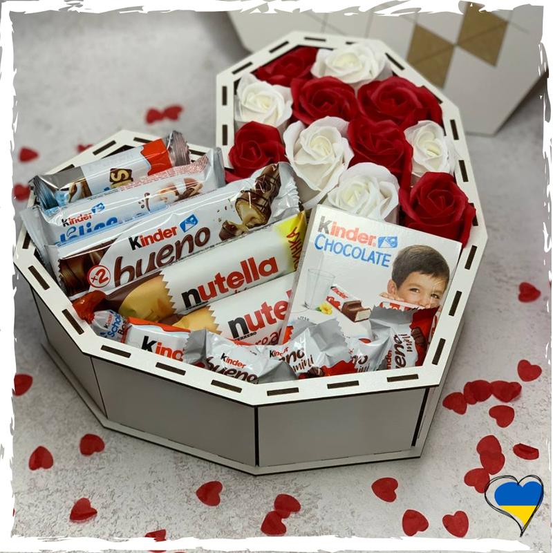 Удиви свою любимую красивым и очень вкусным подарочком 😍 В состав входит: 💫мыльные розы 💫печенье kinder сards 💫шоколадка kinder bueno 💫шоколадка kinder 💫батончик kinder delice 💫батончик nutella (2 шт) 💫батончик kinder maxi 💫kinder schoko bons (конфеты) 💫kinder bueno (конфеты)