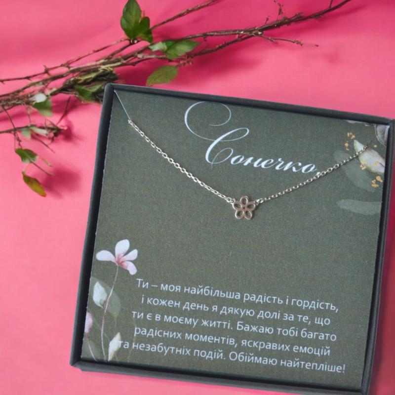 Мініатюрне кольє у формі квітки - це ніжний і витончений подарунок, який стане чудовим сюрпризом для вашої сестри. Виготовлене з увагою до деталей, кольє підкреслить її елегантність та стиль. Квітка на кулоні символізує вашу любов і турботу, нагадуючи про теплі почуття, що вас поєднують. Кольє красиво упаковане в стильну подарункову коробку, а також у комплекті є листівка, на якій ви зможете залишити свої щирі привітання. Це ідеальний подарунок, що зробить вашу сестру щасливою і стане символом вашого незламного зв'язку. Характеристики • біжутерний сплав металів класу LUX, посріблене покриття, гарантія 3 роки • ланцюжок 40-45 см. • індивідуальні листівка із перламутрового картону • подарункова коробка із високоякісного картону чорного кольору, розмір 8*8*3 см Оригінальний та незвичний подарунок точно запам'ятається. Кольє виготовлене із ювелірного сплаву та покрите родієм. Не чорніє, зберігає вигляд та не залишає сліди. Гарантія 3 роки. В комплекті подарункове упакування та інструкція по догляду за прикрасою. Такий подарунок буде єдиний та унікальний, адже це ручна робота. Відправлення здійснюється кожен день транспортною компанією Нова пошта. Також, за бажанням, Ви можете відправити подарунок анонімно. Доступна оплата при отриманні та на карту. Виконуємо персоналізований текст на листівці. Для цього надішліть Ваш текст і ми підготуємо дизайн майбутньої листівки. Термін виконання індивідуального замовлення 1-2 дні. Текст розміщується на листівці 8*8 см. Вартість персоналізованого дизайну +50 грн до суми замовлення.