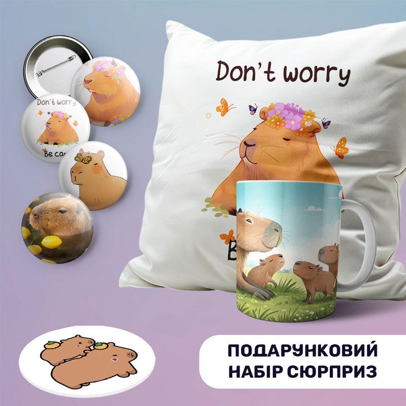 Товари в боксі РАНДОМНІ. Коробка брендована однаково для ВСІХ боксів. Виготовлення боксу 3 робочих дні. Залежно від завантаження на свята терміни можуть змінюватись. Подарочный бокс СЮРПРИЗ состав: - Чашка - Підставка під чашку - Значки - Подушка