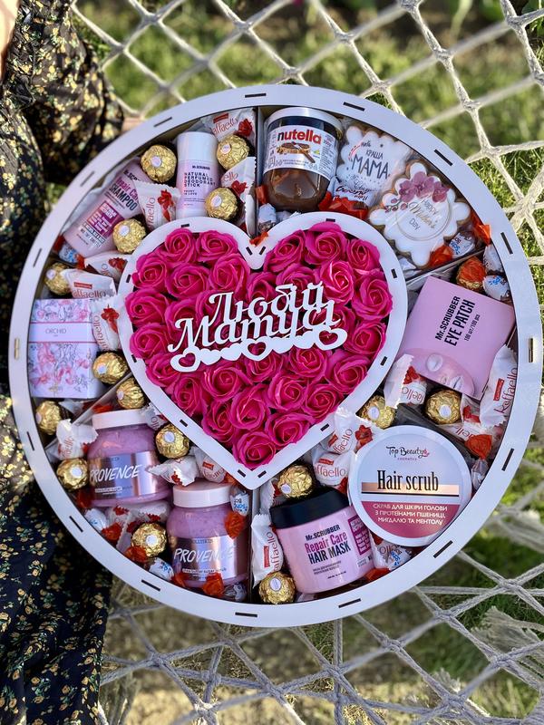 Подарунковий бокс , який вражає своїми розмірами та наповненням 😱 Склад боксу : ▫️Коробка кругла з серцем та відділами, білого кольору 50*10 см ; ▫️Топер «Любій матусі» (можна обрати інший) ; ▫️Мильні троянди в малиновому кольорі 33 шт; ▫️Парфумована вода Zara Orchid , 90 ml , свіжий аромат зі шлейфом вічної весни і тепла ; ▫️Mr. Scrubber Repair Care Shampoo , шампунь для інтенсивного відновлення волосся 200 ml ; ▫️Mr.Scrubber Natural Perfumeb Peony in Love , натуральний парфумований дезодорант 50 g; ▫️Mr. Scrubber Eye Patch 100 шт ; ▫️Top Beauty Hair scrub , скраб для шкіри голови з протеїнами пшениці , мигдалю та ментолу ; ▫️Mr. Scrubber Repair Care , маска для інтенсивного відновлення волосся 300 ml; ▫️ Hollyskin Provence цукровий скраб 300 ml ; ▫️Hollyskin Provence , зволожуючий гель для рук і тіла 300 ml; ▫️Цукерки Ferrero Rocher 16 шт; ▫️Цукерки Raffaello 26 шт; ▫️Цукерки Schoko Bons 15 шт ; ▫️Цукерка Kinder Bueno mini ; ▫️Медово імбирні пряники для мами - 2 шт ; ▫️Nutella 200 g; ▫️Дерев'яний наповнювач. Цей подарунковий бокс із різними засобами з догляду точно їй сподобається 🤫