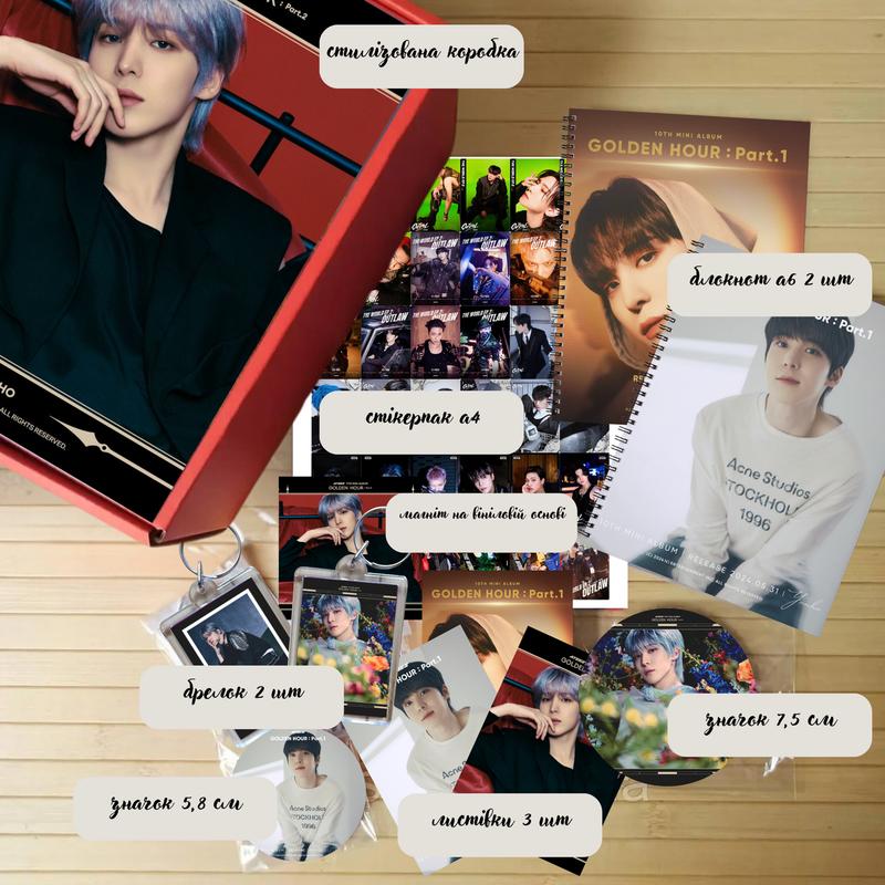 Великий комплект Юнхо Чхве Чонхо (최종호, Choi Jongho) Хок (혁, Hyuk) (SHAX) Ейтіз Эйтиз Ateez 10 предметов - 2 блокноти - 2 брелоки - стикерпак а4 - значок 5,8 см - значок 7,5 см - магніт на вініловій основі - набір листівок 10 х 15 см 3 шт. - коробка