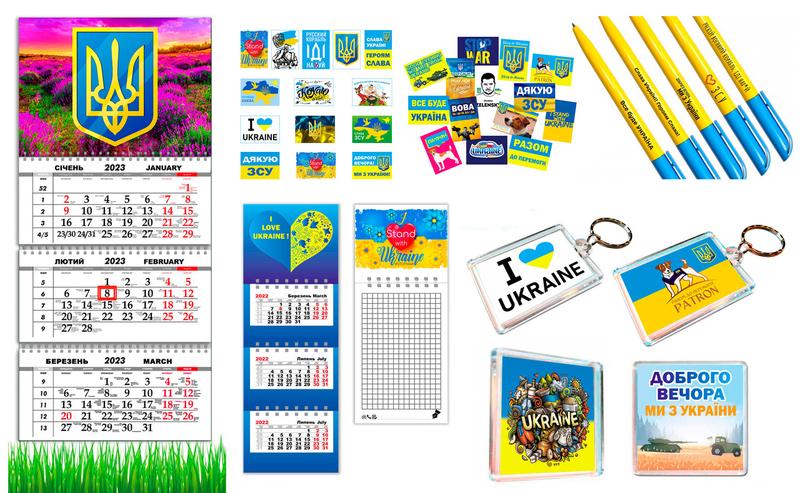 Набір це Магніти (розмір 65мм на 65мм) 2 шт Блокнот для записів на магніті (8,5 на 21 см) 1 шт Календарі сувенірного формату на магніті (21 см на 8,5 см) 1 шт Календар настінний квартальний на 3 пружинах, на 2024 рік (29,7х61 см) 1 шт Брелоки (5,5 на 4 см) 2 шт Набір ручок 5 шт Стікери наклейки самоклеючий папір (5_3,5 см) 28 шт