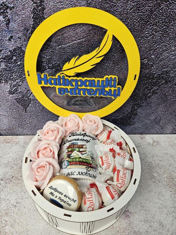 Отличный подарок учительнице на 1 сентября, День учителя, День рождения и другие праздники. В боксе мы собрали: - Чашка 330мл; - Мыльные розы 5-7шт; - Имбирный пряник 1шт; - Конфеты рафаэлло 10шт; - подарочный деревянный наполнитель. - круглая коробка с ДВП. Наполнение, которое точно понравится и станет бюджетным вариантом оригинального подарка. При желании можно изменять бокс, убирать, менять или добавлять компоненты.