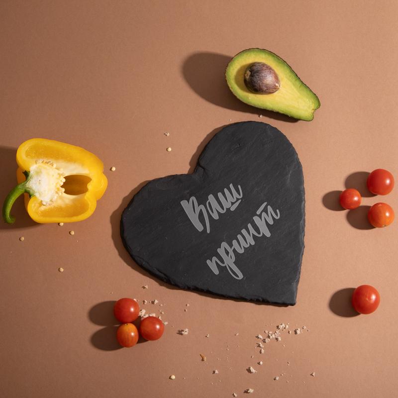 Один из самых нестандартных и крутых подарков близким и любимым, которые любят готовить и дорожат стилем своей кухни -- подставка из сланца в виде сердца. Сланец -- благородный, вулканический материал, который моментально делает из домашней кухни ресторан со звездой Мишлен, а из домашней хозяйки или хозяина -- шеф-повара мирового класса, у которого питаются высокопоставленные чиновники, голливудские звезды и члены списка Форбс. Важно, обратите внимание: Доступное количество символов принта: до 30 с пробелами и знаками препинания. Этот товар требует 100% предоплаты, так как изготавливается на заказ, персонально для вас и не подлежит возврату, кроме случаев присутствия заводского брака.