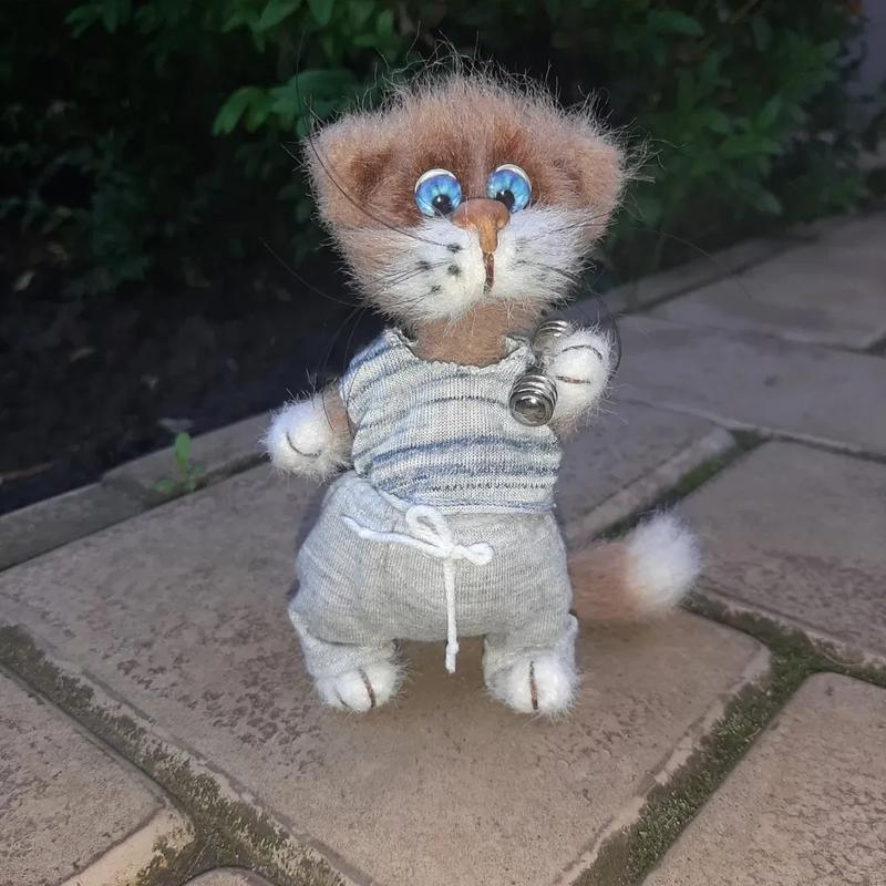 Интерьерная вязаная игрушка ручной работы. Рост 13см, целиком на проволочной каркасе, глазчатая стеклянная, нос слиплен из полимерной глины.