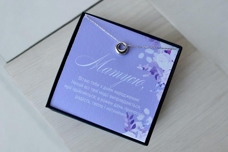 Подарунок мамі на день народження - чарівне кольє та листівка. Характеристики • біжутерний сплав металів класу LUX, посріблене покриття, гарантія 3 роки • ланцюжок 40-45 см. • індивідуальні листівка із перламутрового картону • подарункова коробка із високоякісного картону чорного кольору, розмір 8*8*3 см. Креативний подарунок на день народження - це прикраса серії LUX із листівкою привітанням. Довжина ланцюжка 45 см. Оригінальний та незвичний подарунок точно запам'ятається. Кольє виготовлене із ювелірного сплаву та покрите родієм. Не чорніє, зберігає вигляд та не залишає сліди. Гарантія 3 роки. В комплекті подарункове упакування та інструкція по догляду за прикрасою. Такий подарунок буде єдиний та унікальний, адже це ручна робота. Відправлення здійснюється кожен день транспортною компанією Нова пошта. Також, за бажанням, Ви можете відправити подарунок анонімно. Доступна оплата при отриманні та на карту. Виконуємо персоналізований текст на листівці. Для цього надішліть Ваш текст і ми підготуємо дизайн майбутньої листівки. Термін виконання індивідуального замовлення 1-2 дні. Текст розміщується на листівці 8*8 см. Вартість персоналізованого дизайну +50 грн до суми замовлення.