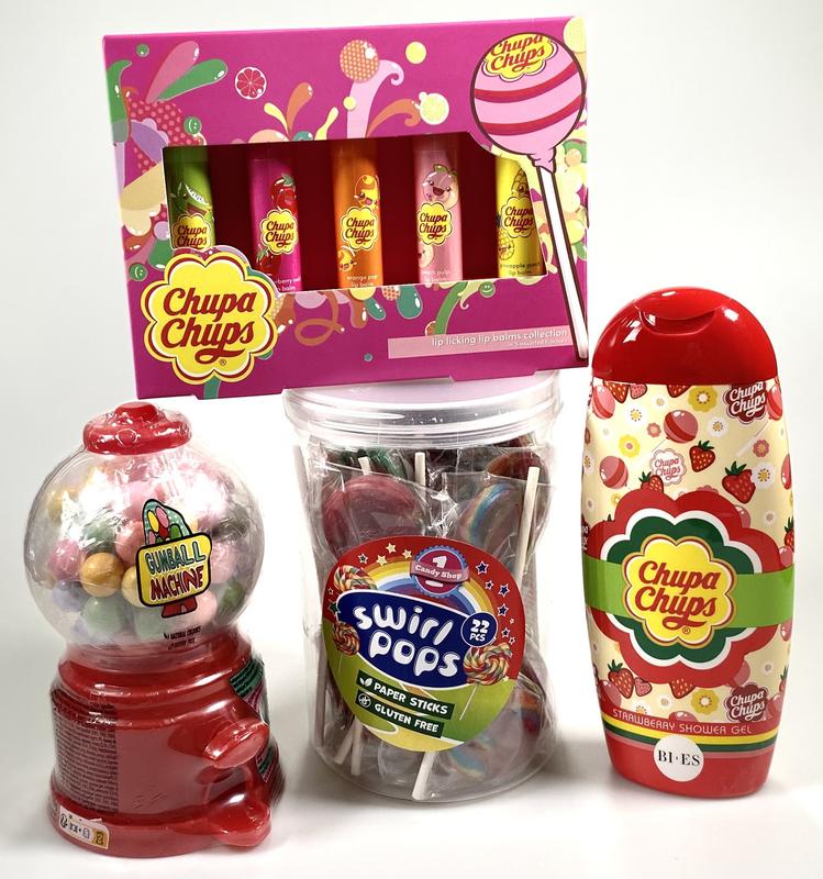 Подарунковий набір «Бокс» Вміст: • Диспенсер з фруктовими гумками 120 грам • Набір льодяників 22 шт «264 грам» • Гель для душу з ароматом полуниці • Набір бальзамів для губ 5 шт • Подарункова упаковка - фігурна коробочка зі стрічкою