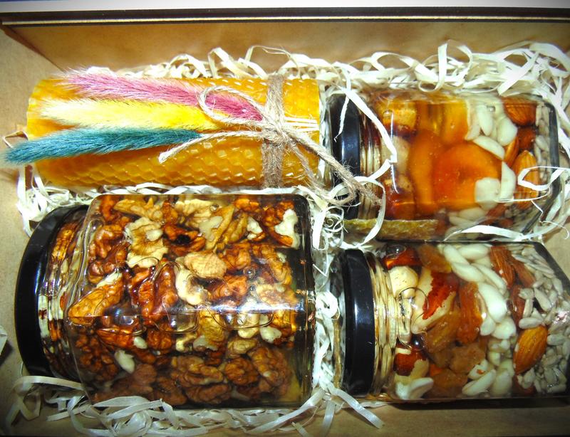 Предлагаем подарочные наборы с натуральными медовыми вкусностями для вас, ваших, друзей, знакомых и близких. Состав: 2 баночки 0.200мл: (Вес 0.350г-1шт) 1 банка 0.400мл: (Вес 0.700г) 1. Грецкий орех 0.400мл 2. Орешки Ассорти - Арахис, Фундук, Кешью, Миндаль, Бразильский орех, семена Подсолнечника, Курага 3. Орешки Ассорти - Арахис, Фундук, Кешью, Миндаль, Бразильский орех, семена Подсолнечника, Изюм Есть готовые наборы или можно собрать свой по вкусу и количеству шт Вкусный и полезный подарок с медом и орешками. Орешки с медом способствуют поднятию настроения, снимают усталость и являются отличным стимулятором умственной активности. Орешки содержат большое количество витаминов и питательных веществ. Такой подарок может храниться без холодильника долгое время! Условия хранения: темное место при комнатной температуре Срок хранения: до 12 месяцев