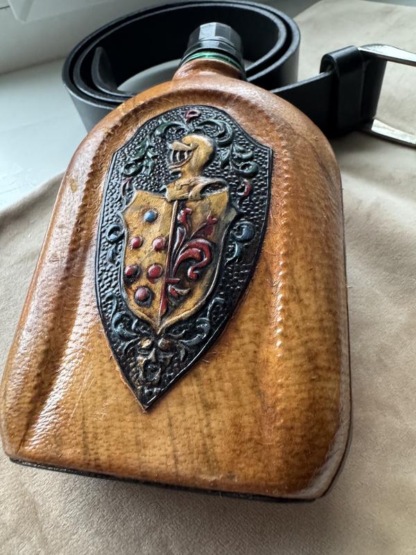 В дуже хорошому стані , немає верхнього ковпачка, нижній закручується, рідину тримає ідеально Фляга обтягнута шкірою, на 250 мл , Італія Такі фляги призначені для міцних спиртних напоїв або кріплених вин