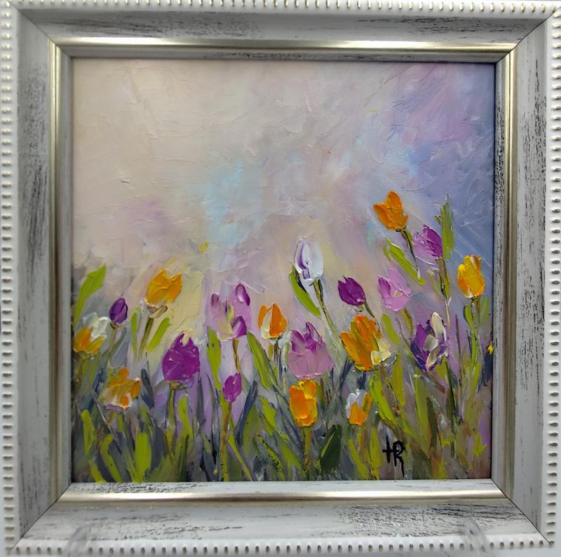 Невелика яскрава картина із зображенням тюльпанового поля, оригінальний живопис олією, 2024р. Розмір 17х17см. В наявності рамка і підставка. Картина повністю готова, щоб стати подарунком до свята.