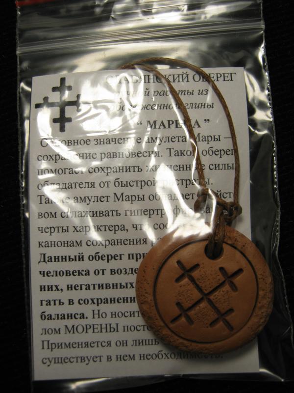 Амулет МОРЕНИ (МАРИ) представляє зображення хреста з рівними сторонами, кожна вершина якого прикрашена міні-хрестом. Іноді її ще називають ЗИМОВИЙ КОСИЙ ХРЕСТ. Символ позначає 4 сторони світу, 4 стихії, 4 пори року, де перекіс має серйозні негативні наслідки. Все у світі має існувати в гармонії і рівновагу порушувати не можна. Основне значення амулета Мари — збереження рівноваги. Такий оберіг допомагає зберегти життєві сили володаря від швидкої розтрати. Також амулет Мари володіє властивістю згладжувати гіпертрофовані риси характеру, що відповідає канонам збереження рівноваги. Цей оберіг покликаний захищати людину від впливу сторонніх, негативних факторів та допомагати у збереженні внутрішнього балансу. Носити оберіг із символом МОРЕНИ постійно не можна. Застосовується він лише тоді, доки існує у ньому необхідність. Слов′янська Богиня Мара (Морена) належить до першого покоління Богів. За однією версією вона доводиться сестрою Лади та Лелі (Живи) і народжена з іскор, що утворилися від удару молота Сварогова по священному каменю Алатир. За переказами, що дійшли до наших днів, Мара є покровителькою чаклунства та магії. Також слов′янська Богиня допомагає перейти немовлятам зі світу Наві у світ Яві. Мару описують як Богиню смерті. Частину джерел пов′язують її зі злом та безвихіддю. Частина говорить про велике призначення «без смерті не буде нового життя». Але незаперечний і той факт, що Мара знаходиться НАД поняттями добра і зла і виконує роботу, що дісталася їй від створення, і яку визначив їй Бог Сварог. Вона постає перед людиною наприкінці життя під час, призначений йому долею, і забирає його у своє царство. Зроблений оберіг із ПРИРОДної глини вручну (у період Повного Місяця), без застосування будь-яких шаблонів чи форм. Барвники, що використовуються при тонуванні, мають природне походження (не лак і не акрилові фарби). Високотемпературний подвійний випал надав природній глині міцності та стійкості до води і перетворив її на кераміку, при цьому зберігши всі чарівні властивості глини як носія сили оберегу.