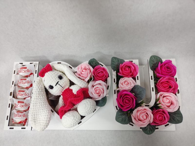 цветы на мыльной основе и вязаный зайчик ручная работа, дополнение конфеты