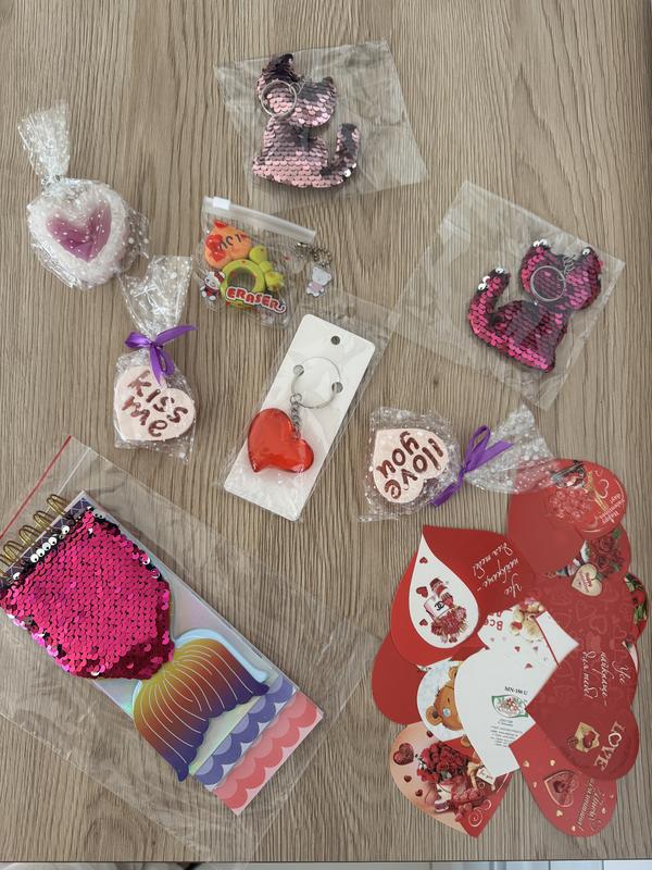 Комплекти сувенірів до 14 лютого, приємні сувеніри для дівчат Ціна в оголошенні вказана за кілька комплектів для зручності відправки та оплати комісії Можна вибрати кілька наборів на свій смак, все новеньке Свічка сердечко та валентинка, 65 грн Набір ластиків з валентинкою, 35 грн Брелок сердечко та валентинка, 65 грн Брелок кішечка та валентинка, 2 шт, по 30 грн Мило та валентинка, 2 шт, по 45 грн Блокнотик рибка з двосторонньою паєткою, 45 грн (блокнот має 3 розділи по 35 сторінок) Ціна за все разом 345 грн, можна вибрати кілька наборів або один, додавши до суми 15 грн