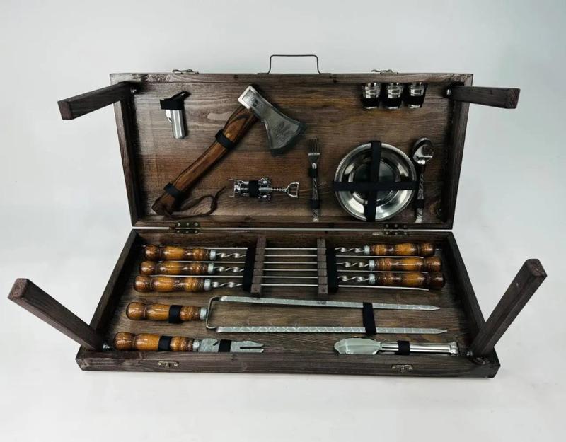 Комплектація: -6 шампурів "Кізляр", товщина металу 3мм -подвійний шампур -виделка-ніж для зняття м’яса -сокира з гербом України -щипці -запальничка -штопор -6 чарок -6 виделок -6 ложек -6 тарілок. Шампура серії "Кізляр" є одними з найпопулярніших у нашому інтернет-магазині - якість, довговічність та комфорт вже встигли оцінити багато наших клієнтів. Саме з цієї причини після своєї появи "Кізляр MAX" швидко став одним із лідерів продажів у категорії набори шампурів. Це чудовий варіант колективного подарунка. Додатковий плюс у тому, що сам кейс легко перетворюється на маленький столик.