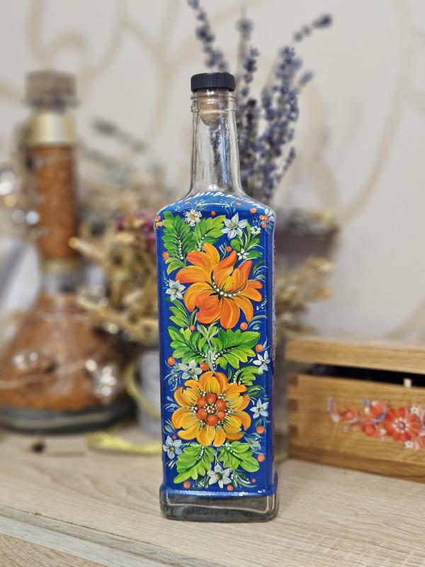 Виріб зі скла (бутиль, що використовувалась для горілчаних напоїв, сама пляшка з-під використання). Сувенірний і практичний подарунок, адже бутиль можна заповнити будь-чим (домашня горілка, домашнє вино, домашні настоянки тощо). Висота виробу 26,6 см.