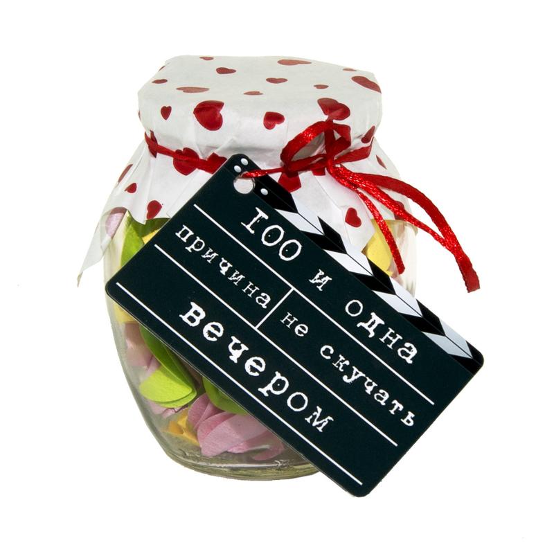 100 і Одна Можливість не нудьгувати ввечері (рос. )- ретельно відібраний нашими фахівцями з яскравих емоцій. Баночка допоможе Вам щодня радувати близьку Вам людину теплими словами кохання. Такий дивовижний сюрприз можна подарувати на день народження або піднести на День сміху або День дурня. Розгортаючи фантики, вимовляйте Подивитися фільм… Зрозуміло, Ви можете постаратися зробити таку банку своїми руками, але це забере у Вас багато часу. Щоб Ви не сиділи кілька годин, вирізуючи фантики та вигадуючи, що ж написати, ми зробили все за вас. Ви можете купити вже готову захоплюючу гру в подарунок рідним та близьким, друзям та знайомим. Інтернет магазин Карнавал Приколів пропонує купити оптом цікаві та оригінальні подарунки за низькими цінами, а також Ви можете оформити замовлення на сайті і задати будь-які запитання менеджеру, замовивши дзвінок на нашому сайті.